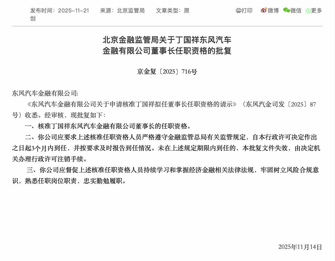 11月21日,国家金融监督管理总局官网显示,北京金融监管局核准丁国祥东风汽车金融有限公司董事长的任职资格。