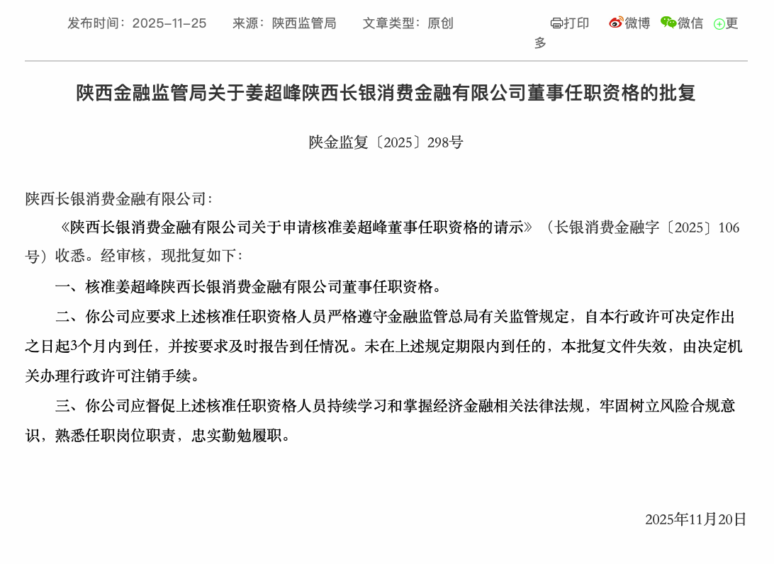 11月25日,国家金融监督管理总局官网显示,陕西金融监管局核准姜超峰陕西长银消费金融董事的任职资格。