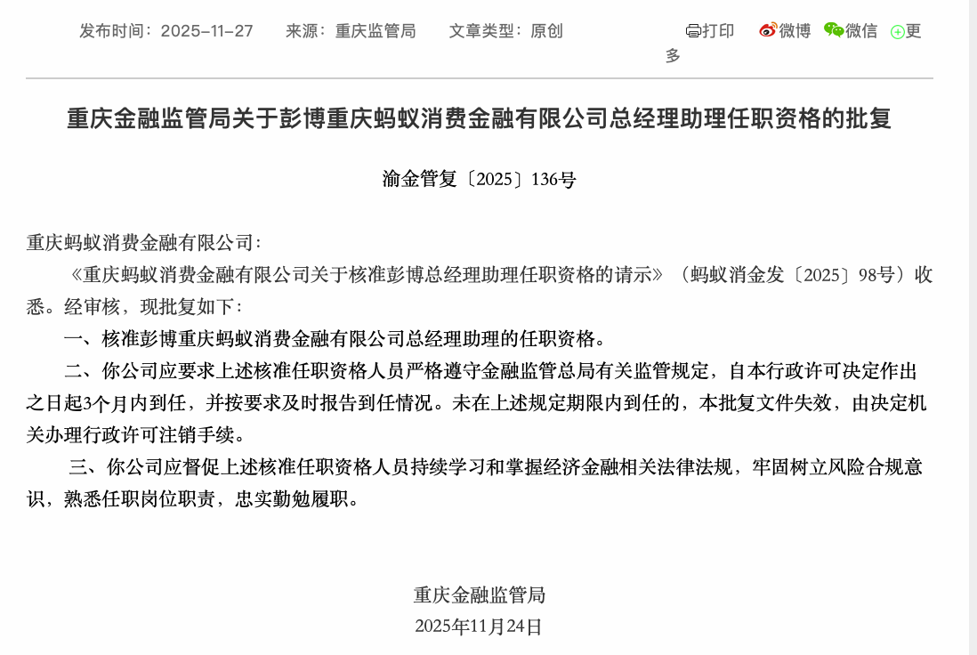 11月27日,国家金融监督管理总局官网显示,重庆金融监管局核准彭博蚂蚁消费金融总经理助理的任职资格。