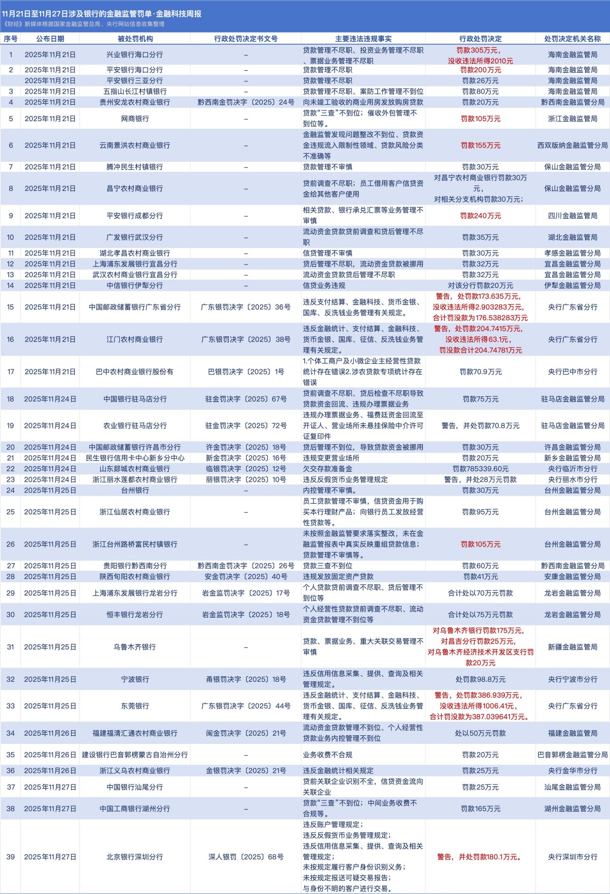 11月21日至11月27日,央行与国家金融监督管理总局官网共披露39张涉及银行的罚单。其中,平安银行有3家分行被处罚,平安银行海口分行与平安银行三亚分行因“贷款管理不尽职”分别被海南金融监管局罚款200万元与罚款26万元;平安银行成都分行因“相关贷款、银行承兑汇票等业务管理不审慎”被四川金融监管局罚款240万元。