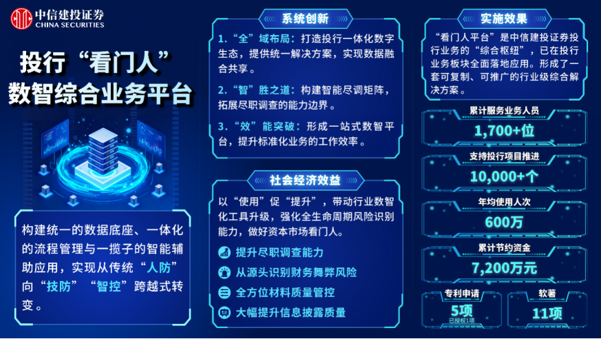 中信建投证券本年度斩获6项大奖,创历年获奖数量新高。 其中,“投行‘看门人’数智综合业务平台”项目荣膺一等奖,成为证券行业投行业务系统中首个摘得金融科技发展奖一等奖的标杆项目。该项目通过构建统一数据底座、一体化流程管理与一揽子智能辅助应用,推动投行合规风控体系提质增效,实现从传统“人防”向“技防”“智控”跨越式转变。其核心突破在于将AI大模型等新技术,深度融入财务舞弊核查、潜在关联关系排查、资金流水核查等10余个传统依赖人工的关键工作场景,大幅提升投行业务人员对财务舞弊、信息披露瑕疵、合规漏洞的识别能力,从源头降低发行人欺诈发行、业绩变脸风险,助力公司高效履行资本市场“看门人”核心职能。截至目前,平台已累计支撑超1万个投行项目全周期推进,累计为公司节约资金超7200万元,并形成了一套可复制、可推广的行业级综合解决方案。