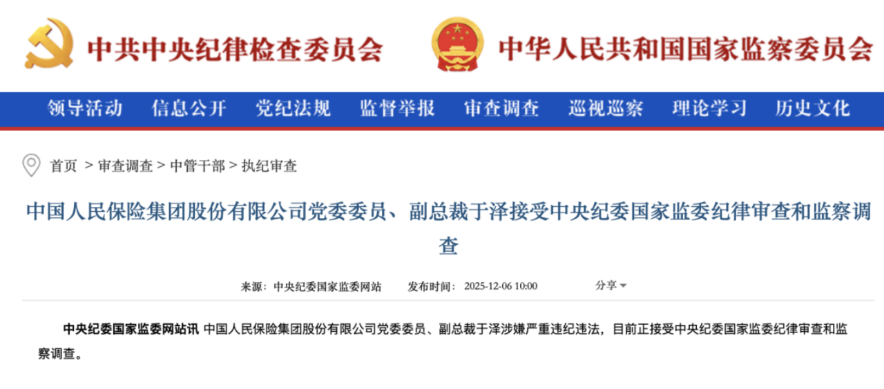 12月6日,据中央纪委国家监委网站通报,中国人民保险集团股份有限公司(下称“中国人保集团”,601319.SH,1339.HK)党委委员、副总裁于泽涉嫌严重违纪违法,目前正接受中央纪委国家监委纪律审查和监察调查。