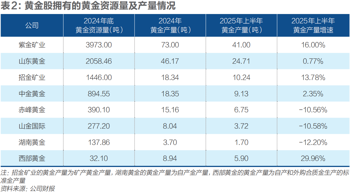 根据2024年报,紫金矿业、山东黄金、中金黄金矿产金产量位居国内前三,分别为73吨、46.17吨以及18.35吨。进入2025年,根据中报,紫金矿业和山东黄金矿产金产量依然稳居行业前两位,招金矿业则取代中金黄金跻身行业第三位。
