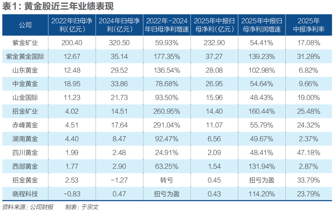 自2023年黄金牛市启动以来,国际金价经过近三年的持续上涨,累计最高涨幅已超130%,此间,国际黄金现货价格从约1800美元/盎司推升至10月中旬的超4300美元/盎司的历史高位。黄金价格的推升,直接利好上游以金矿开采为主营业务的黄金股。受益于金价大涨,A股、港股市场上市的黄金矿业公司业绩迎来爆发式增长,并显示出相比金价涨幅更大的弹性,成为黄金牛市中的赢家。
