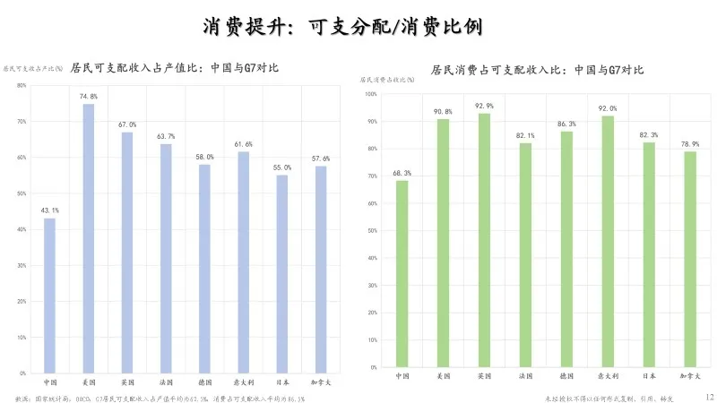 关于提振消费、提振经济,我们关注到一个比较有意思的研究角度,G7为代表的发达国家1970-2023年数据显示,全要素生产率的提升可能推高了消费率的提高。全要素生产率可以看成平均的科技发展的水平,就是资本和人力之外,各种技术改进等等产生的生产提升。发达国家经验显示在相当长的经济发展中居民消费率与全要素生产率关系密切,正向相关。