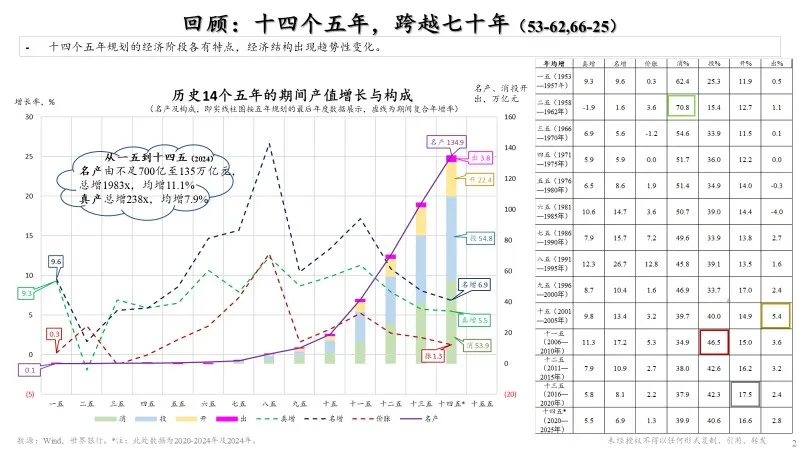 我这里有一张图表,展示了从 1953-1957 年 “一五” 到 2020-2025 年 “十四五” 的 14 个五年规划期间,中国经济的发展历程。尤其改革开放以来,中国经济总体增长成效显著。借此机会想提醒大家,随着经济的长足发展,我们面临的情况也在不断变化。过去是物资匮乏,如今已实现供给充裕。今天有嘉宾提到我国的工业体系,国际工业体系分类中的所有行业我们均已覆盖,未来发展需充分考虑市场饱和、产业转型等多方面问题。