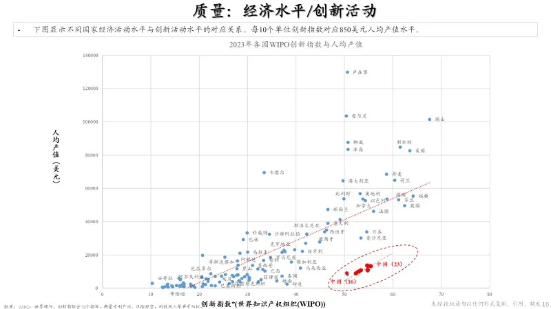 下面是不同国家经济活动水平与创新活动水平的对应关系图,如以人均的产值代表国家经济的水平,粗略地讲,创新的活动越活跃,经济水平越高,人均产值就越高。从2016年到2023年可以看出,我国在不断扩大创新活动,经济水平也在不断加速提升,这是未来10年我们可能达到世界中等发达国家水平的重要基础。