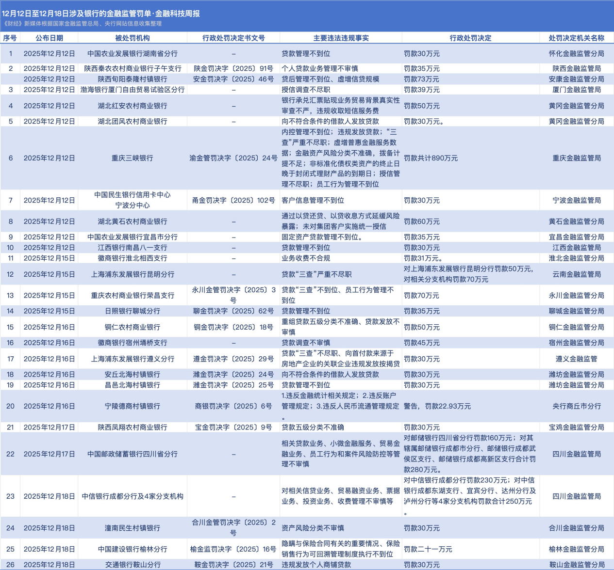 12月12日至12月18日,央行、国家金融监督管理总局官网披露26张涉及银行的罚单。其中,重庆三峡银行因“内控管理不到位;违规发放贷款;‘三查’严重不尽职;虚增普惠金融服务数据;金融资产风险分类不准确,拨备计提不足;非标准化债权类资产的终止日晚于封闭式理财产品的到期日;授信管理不尽职;员工行为管理不到位”被重庆金融监管局罚款共计890万元。