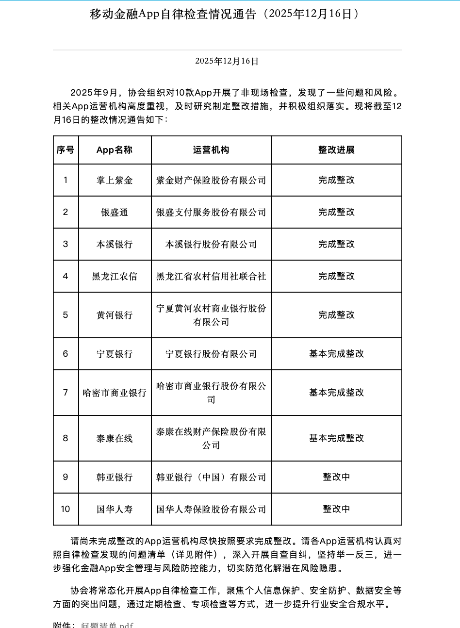 12月17日,中国互联网金融协会发布的“移动金融App自律检查情况通告”显示,今年9月,协会组织对10款App开展了非现场检查,发现了一些问题和风险。相关App运营机构高度重视,及时研究制定整改措施,并积极组织落实。截至12月16日,掌上紫金、银盛通、本溪银行、黑龙江农信、黄河银行等App已完成整改,宁夏银行、哈密市商业银行、泰康在线等App已基本完成整改,韩亚银行、国华人寿等App仍在整改中。