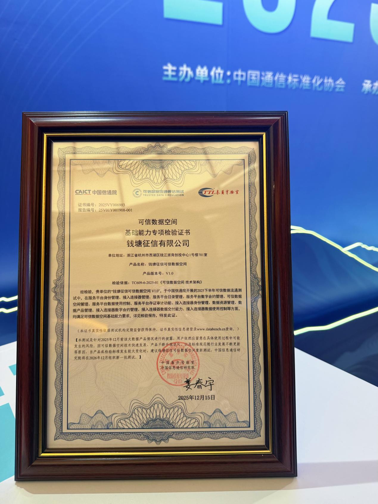 图说:钱塘征信可信数据空间获得中国信通院可信数据空间基础能力专项检验证书