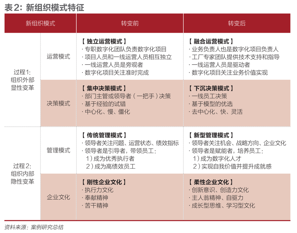 这一变化可从某工控类工厂的排产升级中看到完整链路。过去排产依靠老师傅经验,面对多品类、小批量订单时反应慢、波动大。企业在推进智能排产项目时,并不是简单将排产流程数字化,而是重构了组织的知识生产方式。一线员工将隐性的操作规则、经验判断等转化为可描述的显性知识;专家团队将这些显性知识与设备、人员、工艺等多维数据融合,构建系统化的排产模型;模型经迭代后下沉至一线,决策从“依赖经验”转向“依赖模型”,响应速度和稳定性显著提升。在这一过程中,组织由“社会化—外显化—组合化—内隐化”的知识螺旋不断循环,显性知识不断固化为模型,模型又在实际应用中为员工吸收、再沉淀为新的隐性能力。结果是,组织建立起可持续迭代的知识体系,运营行为也逐步从经验式向智能化转变,决策模式、管理模式和企业文化也发生适配性转变。