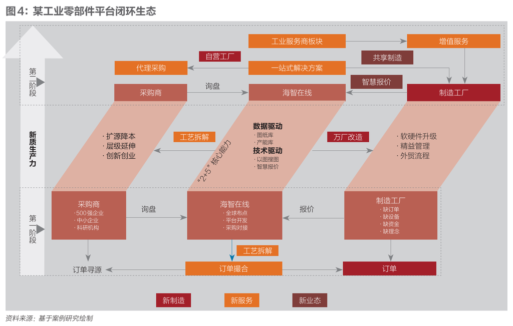 如果说该跨境电商企业重塑了消费端驱动的产业,那么某工业零部件平台则在更为复杂和传统的工业零部件领域,实践着产业超级协同。它扮演着“产业路由器”的角色,将全球分散的非标零部件需求与中国庞大的离散制造产能,进行精准、高效的匹配与协同。前端利用智能图纸解析和150多项标准化标签,将零散订单转化为结构化数据,实现复杂询价的即时响应;中端对超70万家工厂进行数字化建模,智能拆解复杂订单并规划最优生产路径,实现跨厂精准调度;后端通过聚合小批量订单、信用评价体系及供应链金融等服务,降低成本并增强交易信任。
