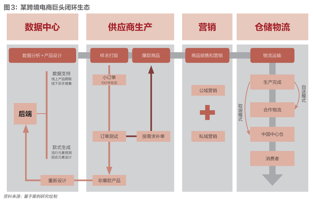 某跨境电商巨头重新定义了快时尚的生产逻辑,将传统服装产业的线性链条重塑为智能化的数字生态系统。平台以全球消费数据为起点,通过AI实时识别趋势,并以“小单快返”模式将首批订单限定在百件量级,由市场反馈决定扩单。在中端,平台将数百家供应商接入统一系统,实时协同订单、产能和物料;供应商在平台推动下引入智能比色、自动裁剪和高速缝纫等设备,分散产能被整合成一张云制造网络。前端销售、制造与物流形成闭环,使行业摆脱传统服装产业链的长周期与高库存,实现约30天的库存周转。本质上,这是一个以数据统筹需求预测、产能匹配与供应链调度的柔性生态系统。