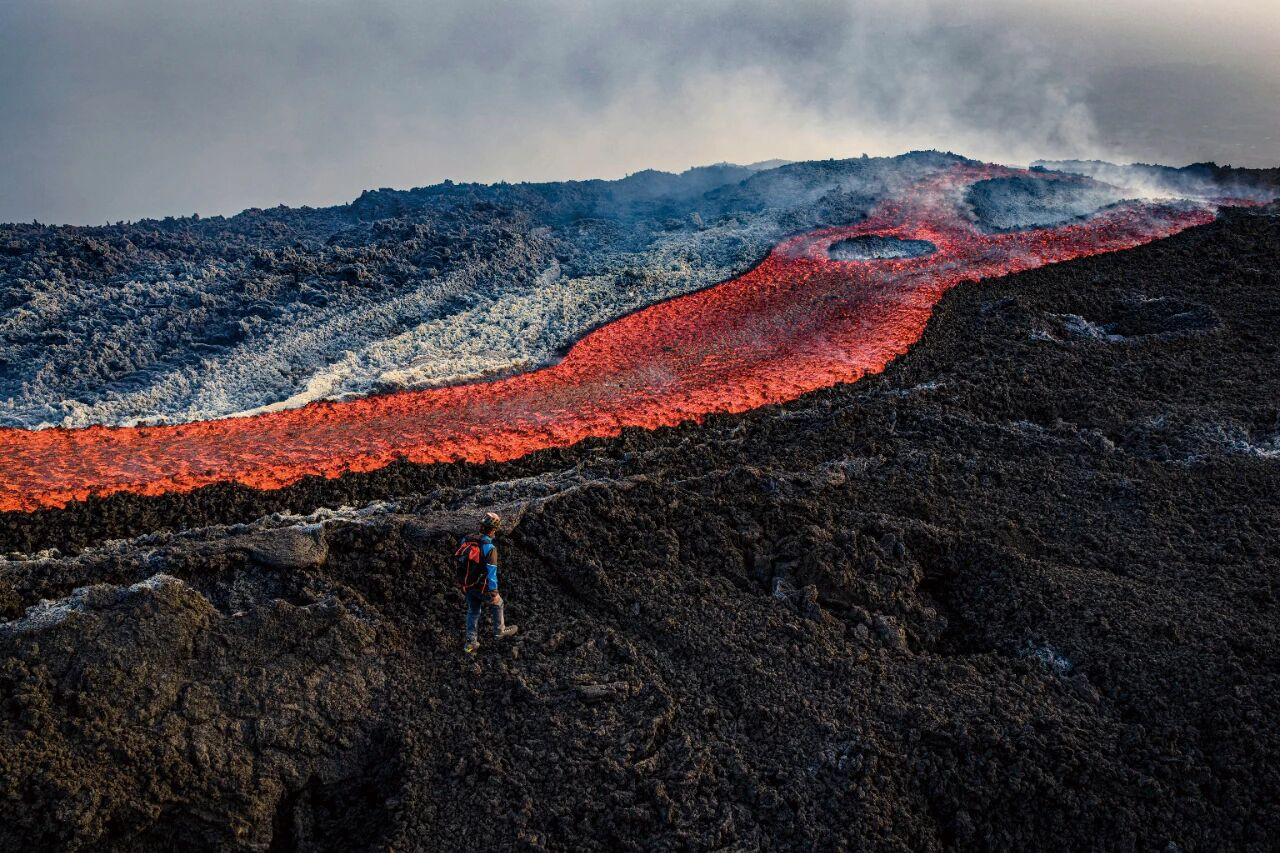 8月28日,一名男子在意大利埃特纳火山流淌的岩浆旁徒步。埃特纳火山高3300多米,是欧洲最高、活动最频繁的活火山,也是著名旅游胜地,每年吸引约150万游客到访,其中许多人 选择徒步登顶。图/AFP