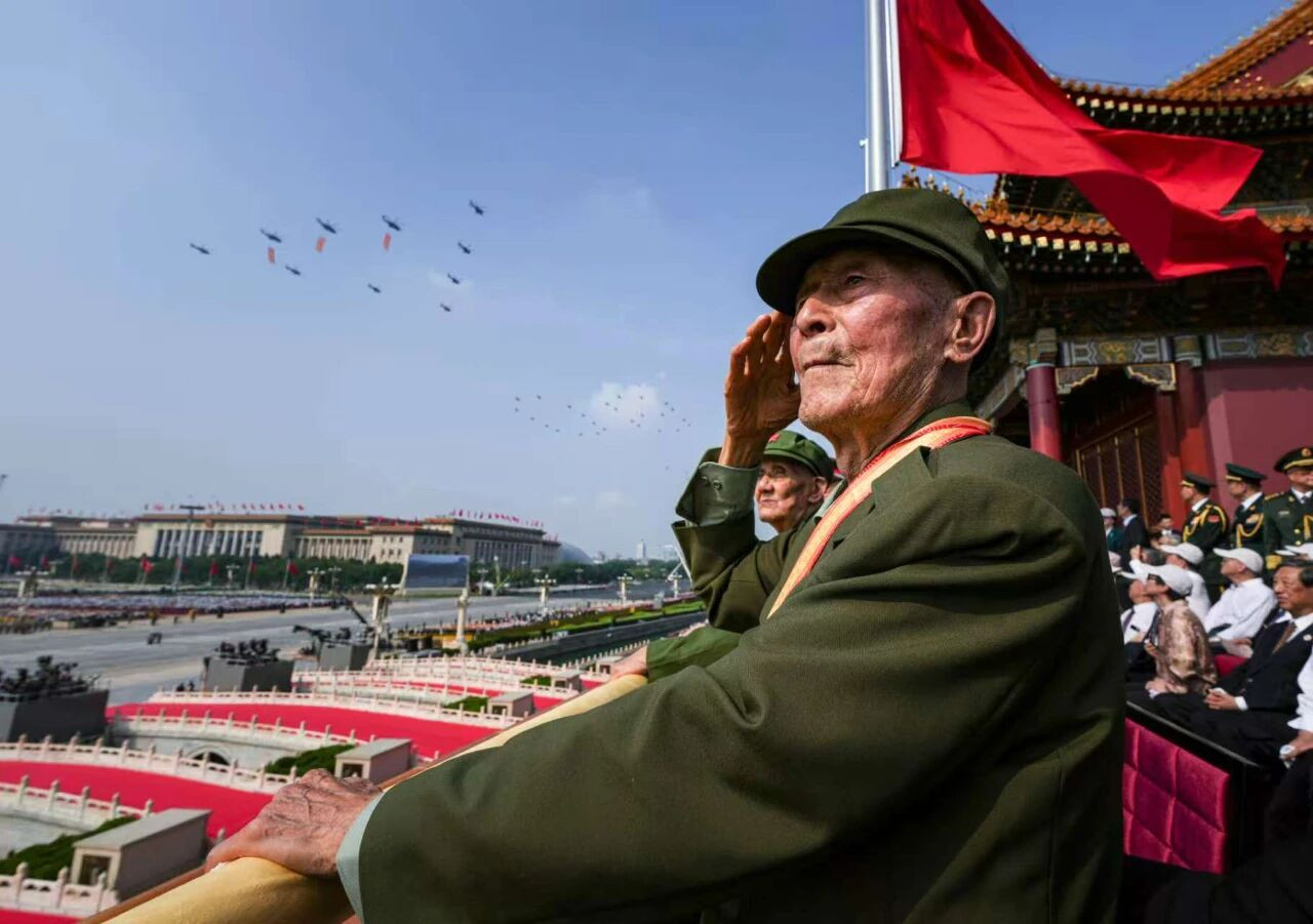 9月3日,纪念中国人民抗日战争暨世界反法西斯战争胜利80周年大会在北京隆重举行。抗战老战士在天安门城楼上敬礼。图/新华