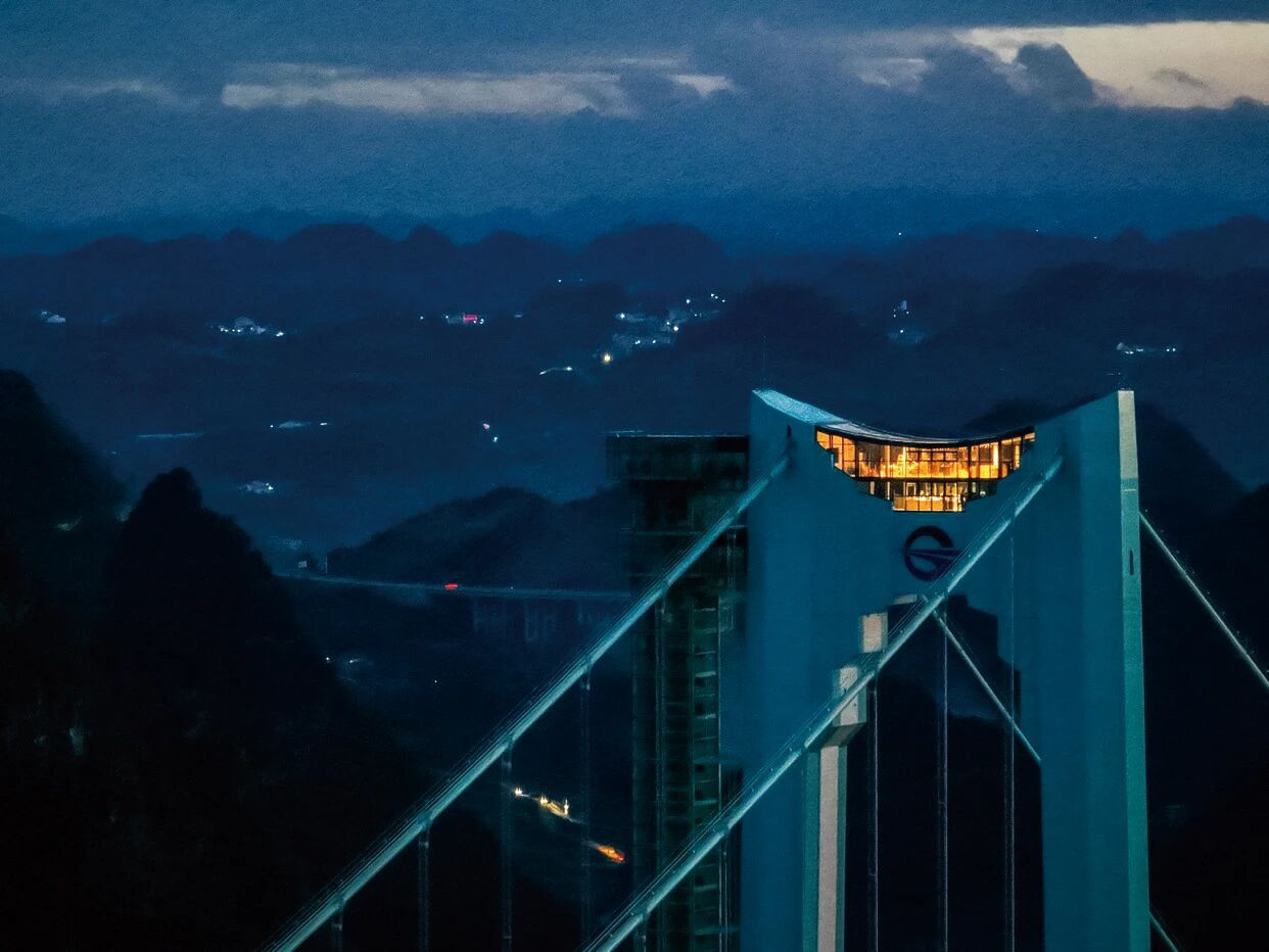 贵州大力发展桥旅文化,新开通的花江峡谷大桥服务区正式名称为“云渡服务区”,已成为兼具交通服务与旅游体验的桥旅融合新地标。可搭乘观光电梯直达大桥贞丰岸主塔顶部的云端咖啡,体验360度景观视野和精品咖啡。图/新华