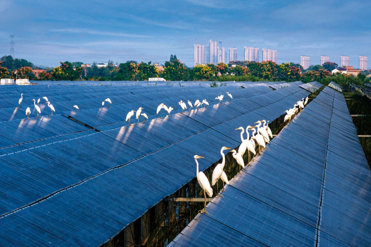 9月28日,安徽省芜湖市繁昌区平铺镇新塘村,白鹭等鸟儿栖息在渔光互补光伏电站的光伏 板上。近年来,繁昌区有效利用丰富滩涂资源,通过水上发电、水下养鱼的立体化渔光互补发电模式,推动能源清洁低碳转型,提高综合效益,促进当地经济、生态双丰收。图/中新
