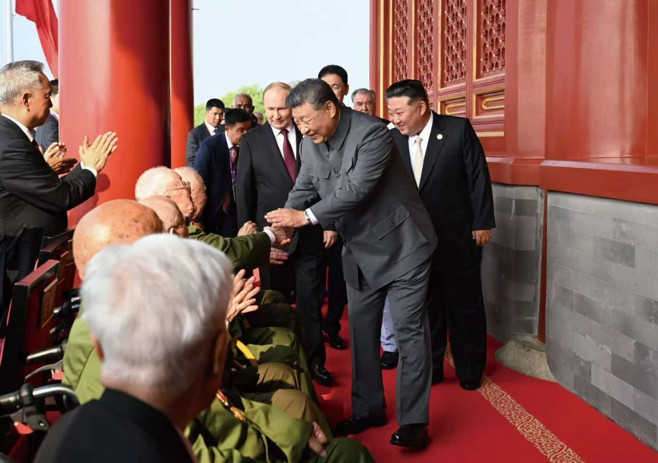 9月3日,纪念中国人民抗日战争暨世界反法西斯战争胜利80周年大会开始前,中共中央总书记、国家主席、中央军委主席习近平同抗战老战士老同志代表亲切握手,向他们表示崇高敬意。图/新华