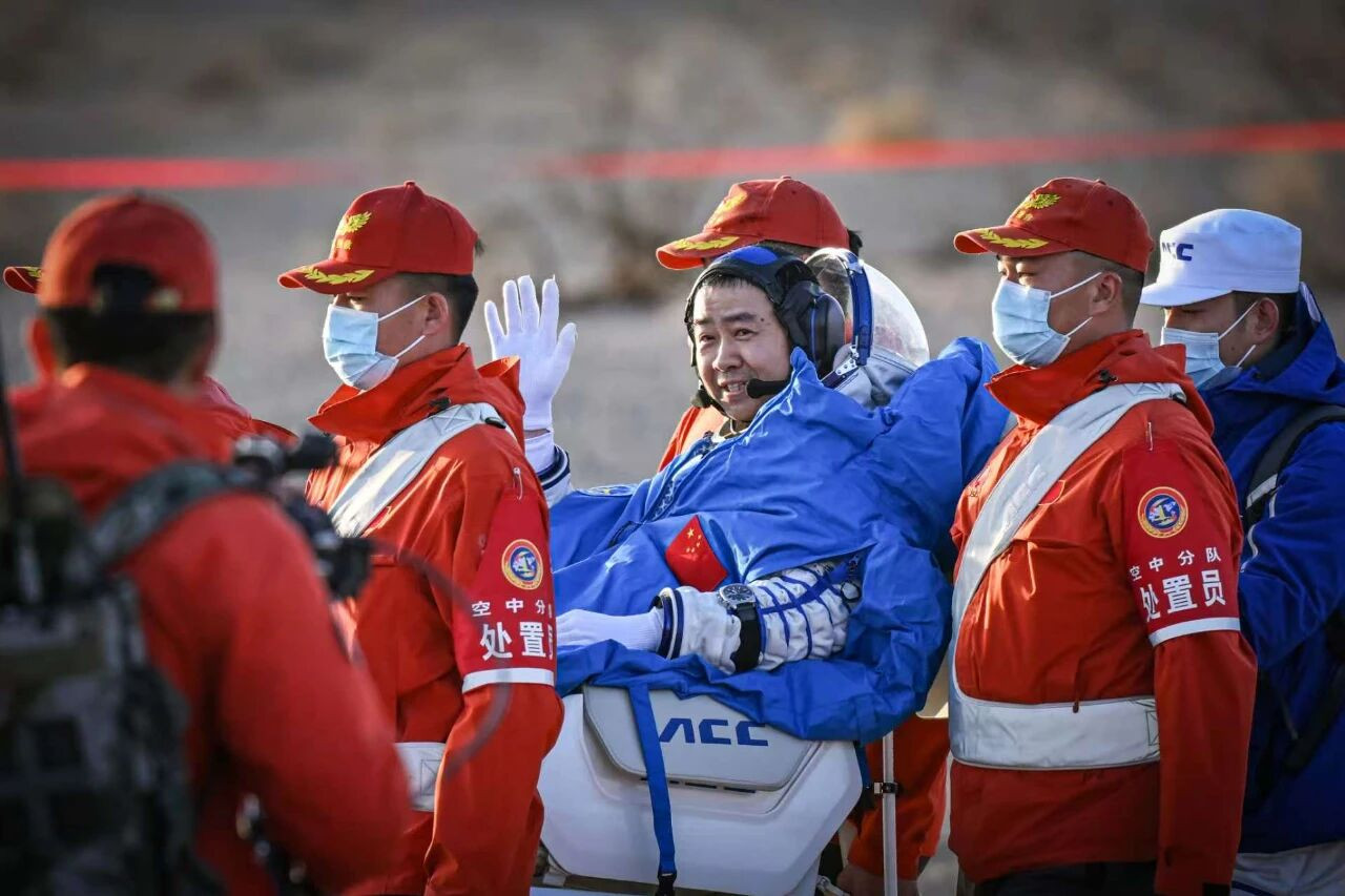 11月14日载着神舟二十号航天员乘组的神舟二十一号载人飞船返回舱在东风着陆场成功着陆。航天员陈冬安全顺利出舱。图/新华
