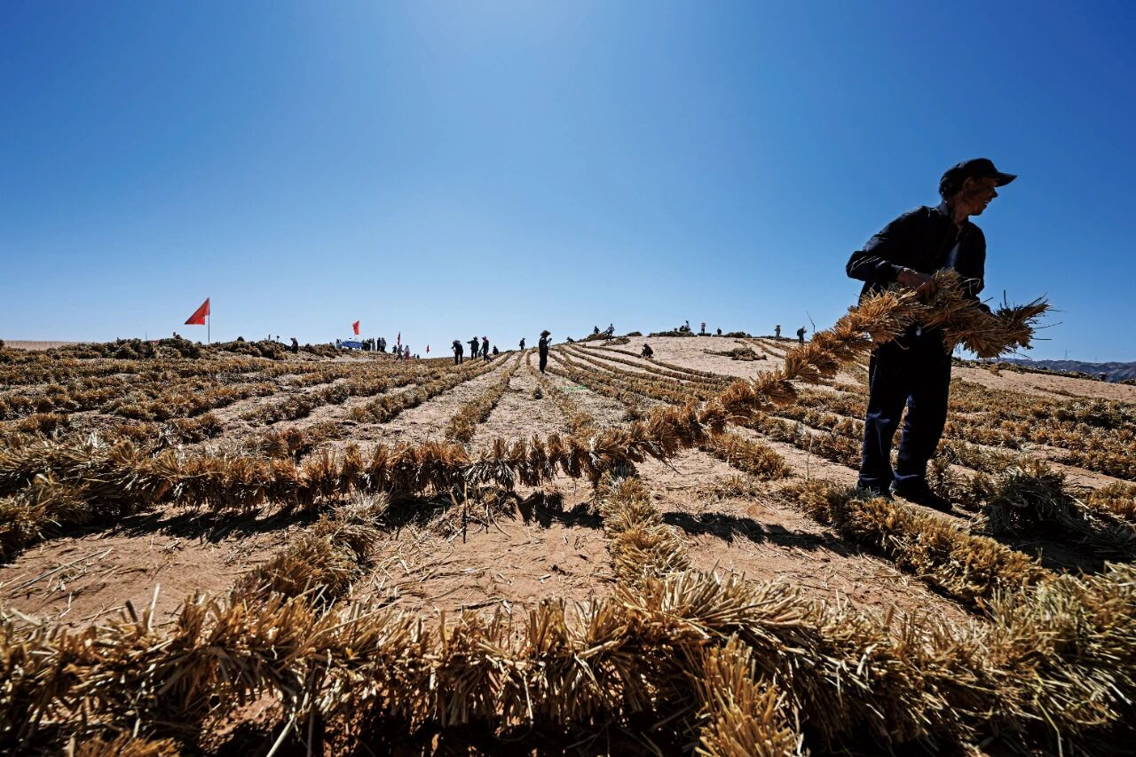 6月30日,治沙工人在长流水村扎草方格。当日,在位于宁夏中卫市长流水村的腾格里沙漠 东南缘,随着治沙工人将最后一列草方格稳稳扎下,这项跨越半个世纪的治沙工程,在腾格 里沙漠宁夏境内实现全面“锁定”。一条长153公里、最宽处达38公里的固沙锁边带蜿蜒开 来。该工程全线贯通后,将在黄河上游筑起一道重要生态屏障,对遏制腾格里沙漠扩张、保护黄河安澜、改善区域生态环境、促进当地经济社会可持续发展具有重要意义。图/新华