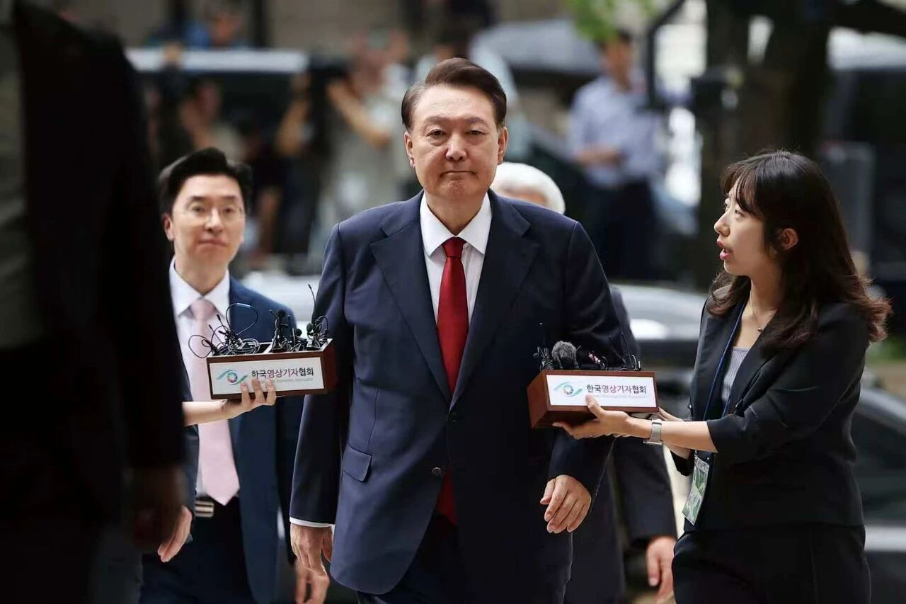 7月9日,韩国前总统尹锡悦抵达首尔中央地方法院接受讯问。韩国首尔中央地方法院7月10日凌晨签发对前总统尹锡悦的逮捕令。据韩联社报道,负责调查紧急戒严事件的特检组随后实施逮捕。这是尹锡悦获释四个月后再次被捕。图/视觉中国