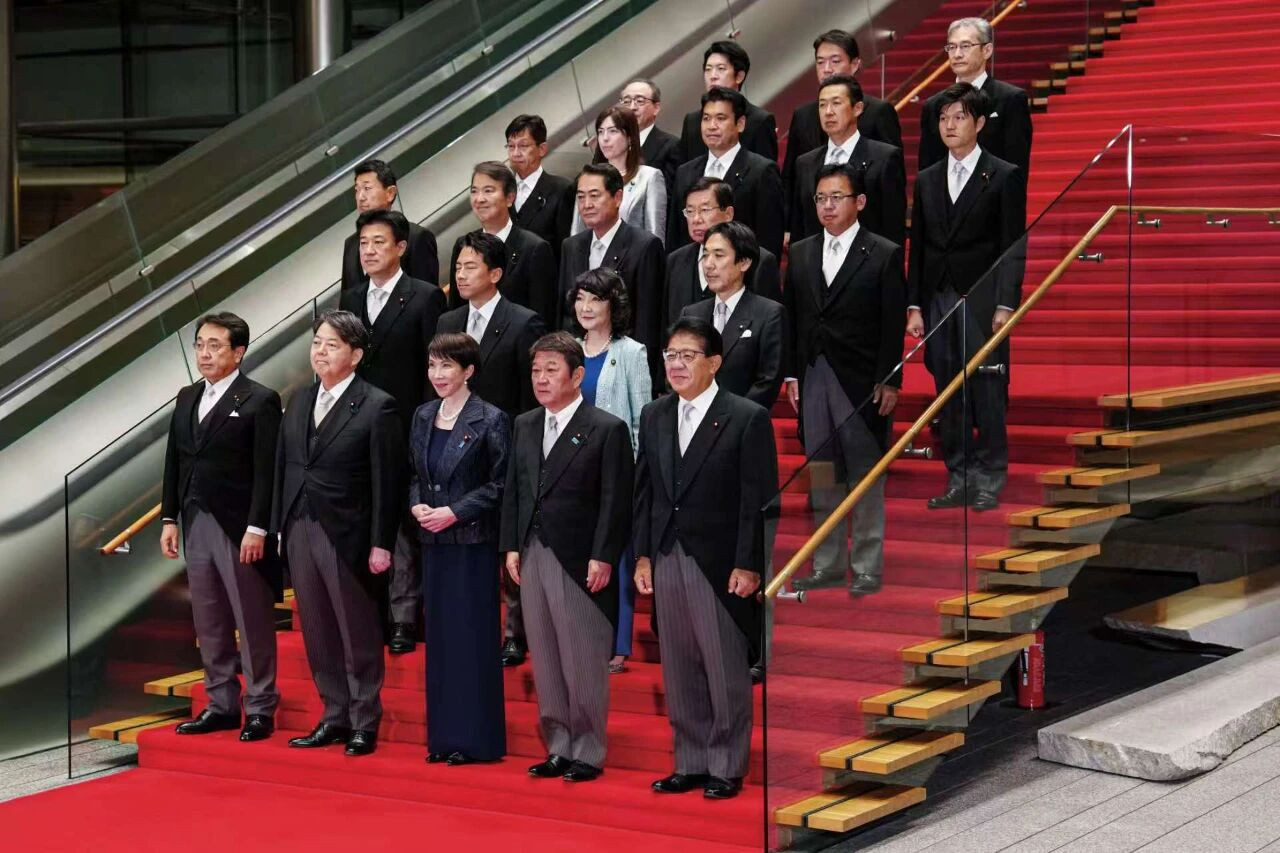 10月21日晚,日本首相高市早苗(前排中)在东京的首相官邸率阁僚合影。当日,日本自民党总裁高市早苗在临时国会众议院和参议院首相指名选举中均胜出,当选日本第104任首相。她是日本首位女首相。图/新华