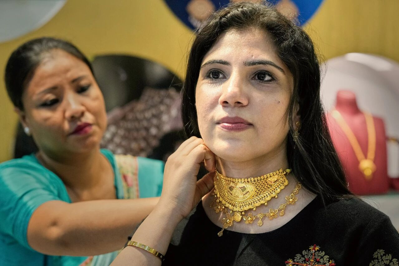 10月18日,印度阿萨姆邦一家商场内,销售员向顾客展示一条黄金项链。至2025年末,国际金价累计涨幅超过70%。图/视觉中国