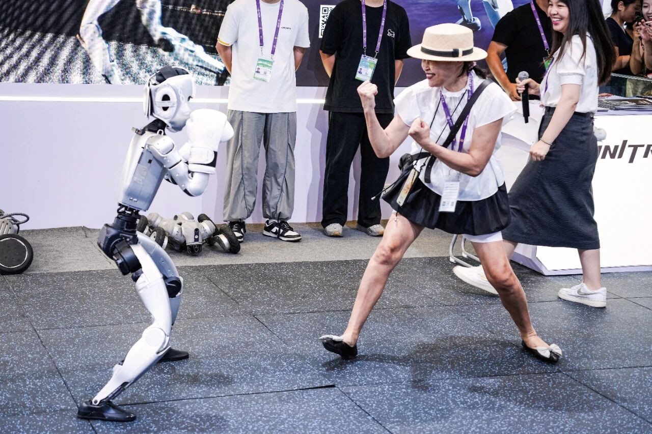 9月19日,在广西南宁市举办的第22届中国—东盟博览会上,一台人形机器人表演“拳击”, 与观众互动。图/新华