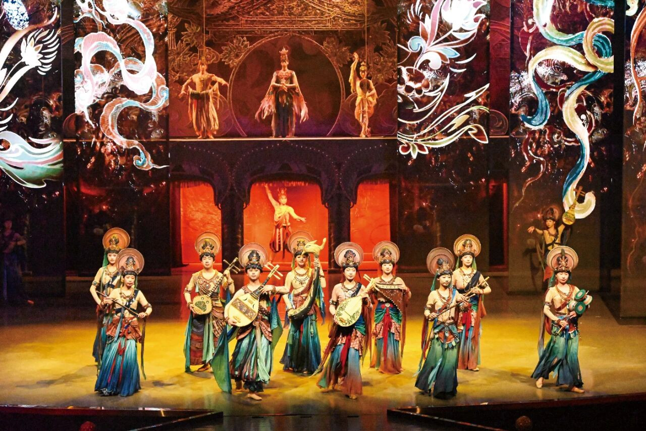 10月9日,表演中的大型洞窟式沉浸体验剧《乐动敦煌》。《乐动敦煌》借助对莫高窟壁画、藏经洞古籍的解读梳理,活化敦煌古乐器、古乐谱研发成果,通过全息投影等手段,结合专业演 员的表演,将莫高窟壁画中的乐舞盛景生动再现,让观众沉浸式感悟传承千年的敦煌乐舞文化魅力。图/中新