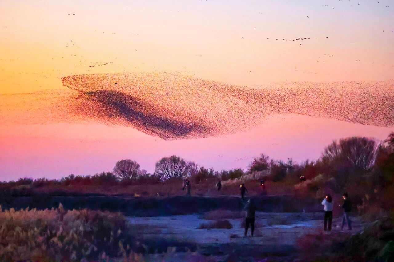 12月8日傍晚,山东省东营市黄河三角洲国家级自然保护湿地的上空,出现万鸟化“鲲鹏”的 “鸟浪”奇观。黄河三角洲作为候鸟迁徙通道的重要驿站,每年秋冬季都会形成壮观的“鸟浪” 现象。图/视觉中国