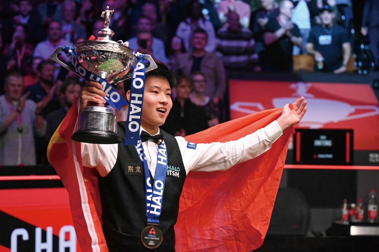 5月5日,在英国谢菲尔德举行的2025年斯诺克世锦赛决赛中,中国选手赵心童18比12战胜威尔士选手威廉姆斯,成为首位获得该项赛事冠军的亚洲选手。图/视觉中国