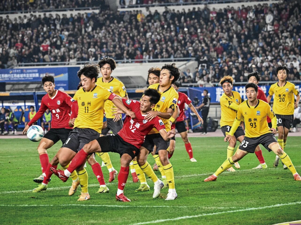 2025年,各地城市足球联赛火热举行。11月1日,在江苏南京举行的2025江苏省城市足球 联赛(“苏超”)决赛中,南通队与泰州队在常规时间0比0战平,通过点球大战,泰州队总比 分4比3战胜南通队,夺得冠军。图为泰州队球员巴特(前左)和南通队球员齐丹(前右)在比赛中拼抢。图/新华