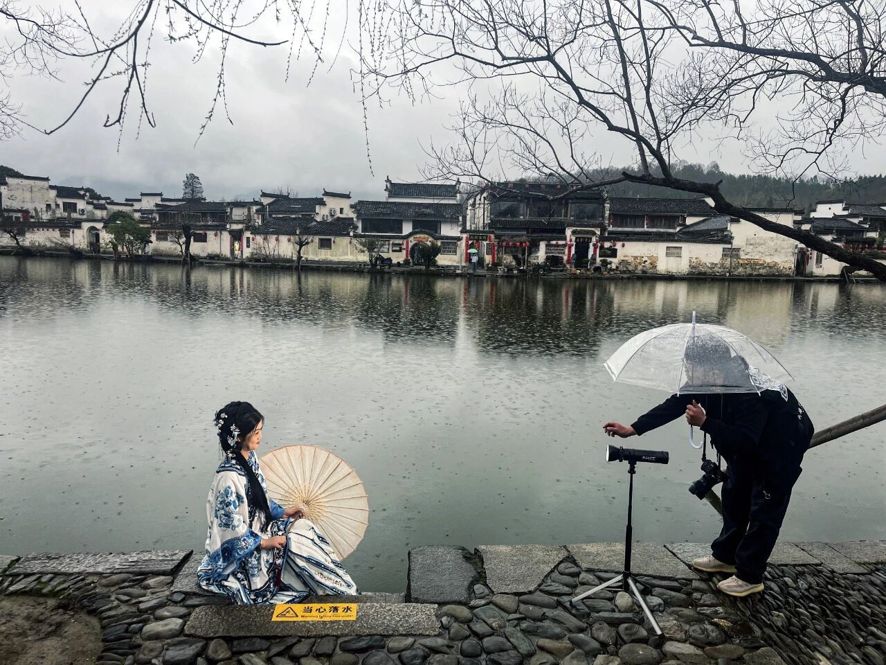 3月13日,安徽省黄山市,游客在黟县宏村镇宏村留影。图/新华