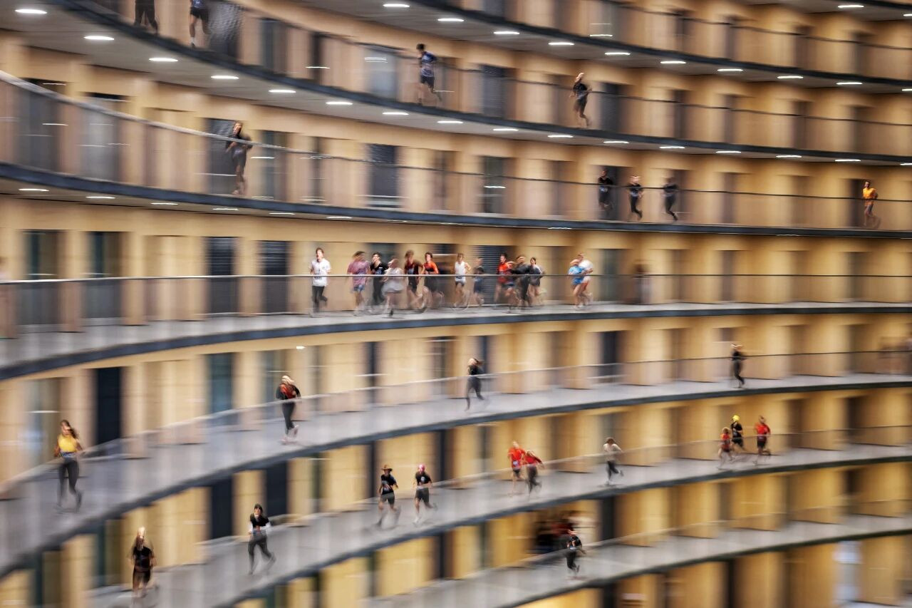 10月16日,参赛者在洛桑Vortex大楼各个楼层内奔跑。Vortex跑酷是由一群学生于2021 年创立的独特比赛,内容是在瑞士洛桑大学标志性的八层圆形建筑Vortex大楼2.8公里长的 螺旋形通道上奔跑。本年度约有2000名参赛者,其中大多数是学生。图/AFP