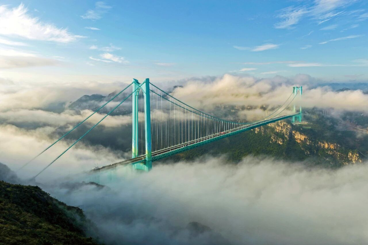 9月28日,世界第一高桥——贵州花江峡谷大桥建成通车。花江峡谷大桥是贵州六枝至安龙 高速公路的控制性工程,大桥全长2890米,主跨径1420米,是目前世界山区峡谷第一大跨 度钢桁梁悬索桥;其桥面距水面垂直高度625米,超越北盘江第一桥成为新的世界第一高桥, 被誉为“横竖都是第一”。图/视觉中国