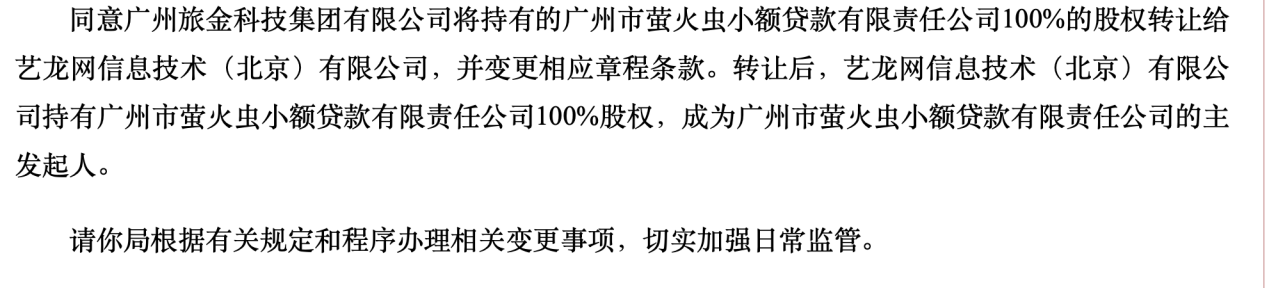 1月5日,广州市金融管理局发布关于广州市萤火虫小额贷款有限责任公司变更股东股权的批复显示,同意广州旅金科技集团有限公司将其持有的广州市萤火虫小额贷款有限责任公司100%的股权转让给艺龙网信息技术(北京)有限公司,同时变更相应章程条款。此次转让完成后,艺龙网信息技术(北京)有限公司将持有广州市萤火虫小额贷款有限责任公司100%股权,并成为该公司的主发起人。