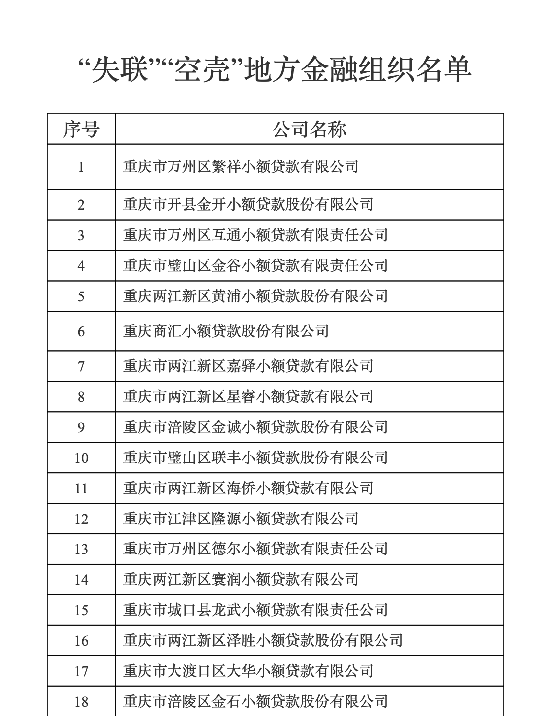 重庆市地方金融监督管理局公示37家“失联”“空壳”小贷公司