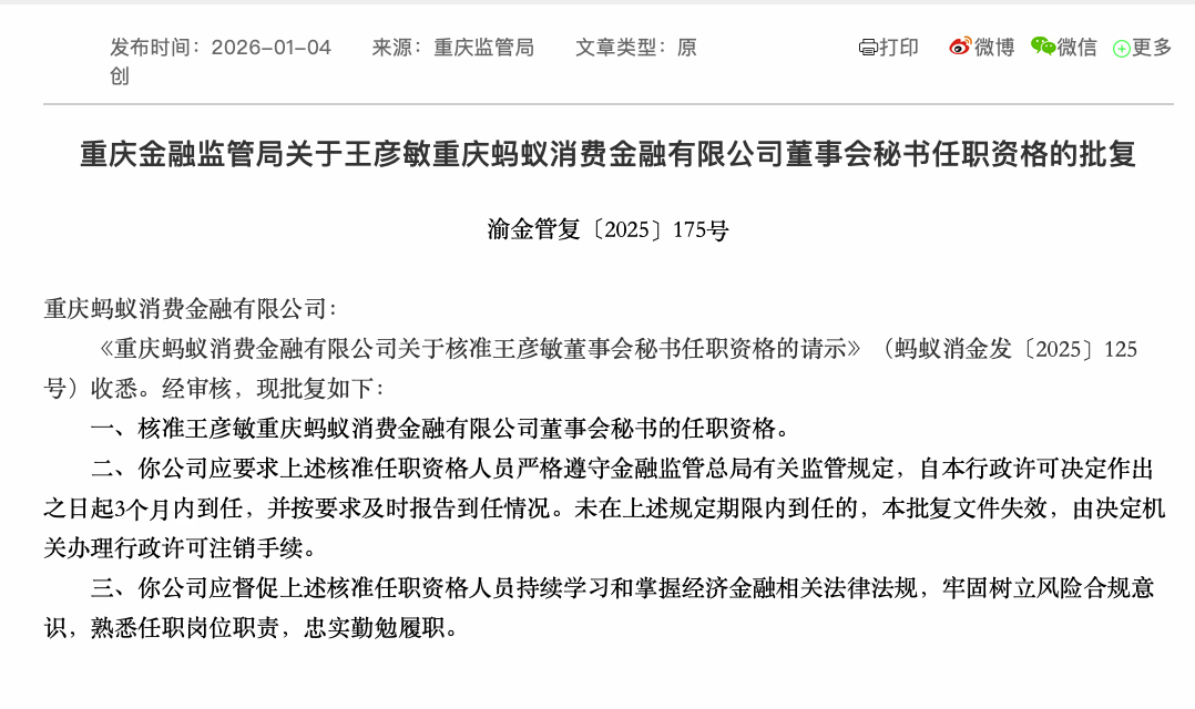 1月4日,重庆金融监管局披露,核准王彦敏重庆蚂蚁消费金融有限公司董事会秘书的任职资格。需要注意的是,王彦敏此前于2024年11月被重庆金融监管局核准担任蚂蚁消费金融首席合规官。