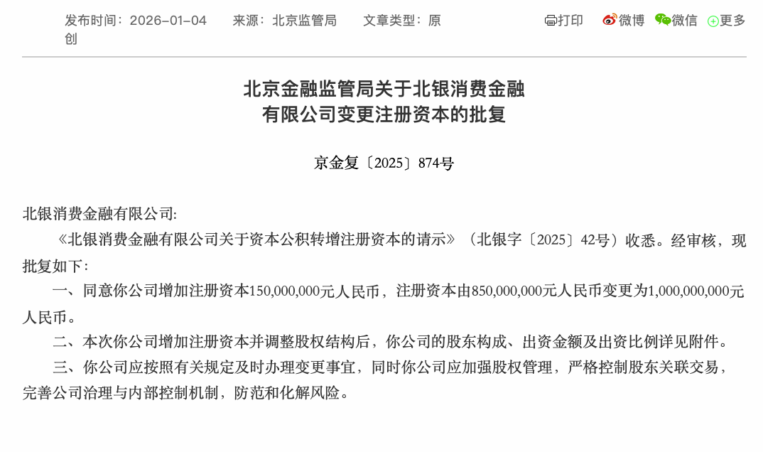 1月4日,国家金融监督管理总局官网显示,北京金融监管局同意北银消费金融有限公司增加注册资本1.5亿元,由8.5亿元变更为10亿元人民币。