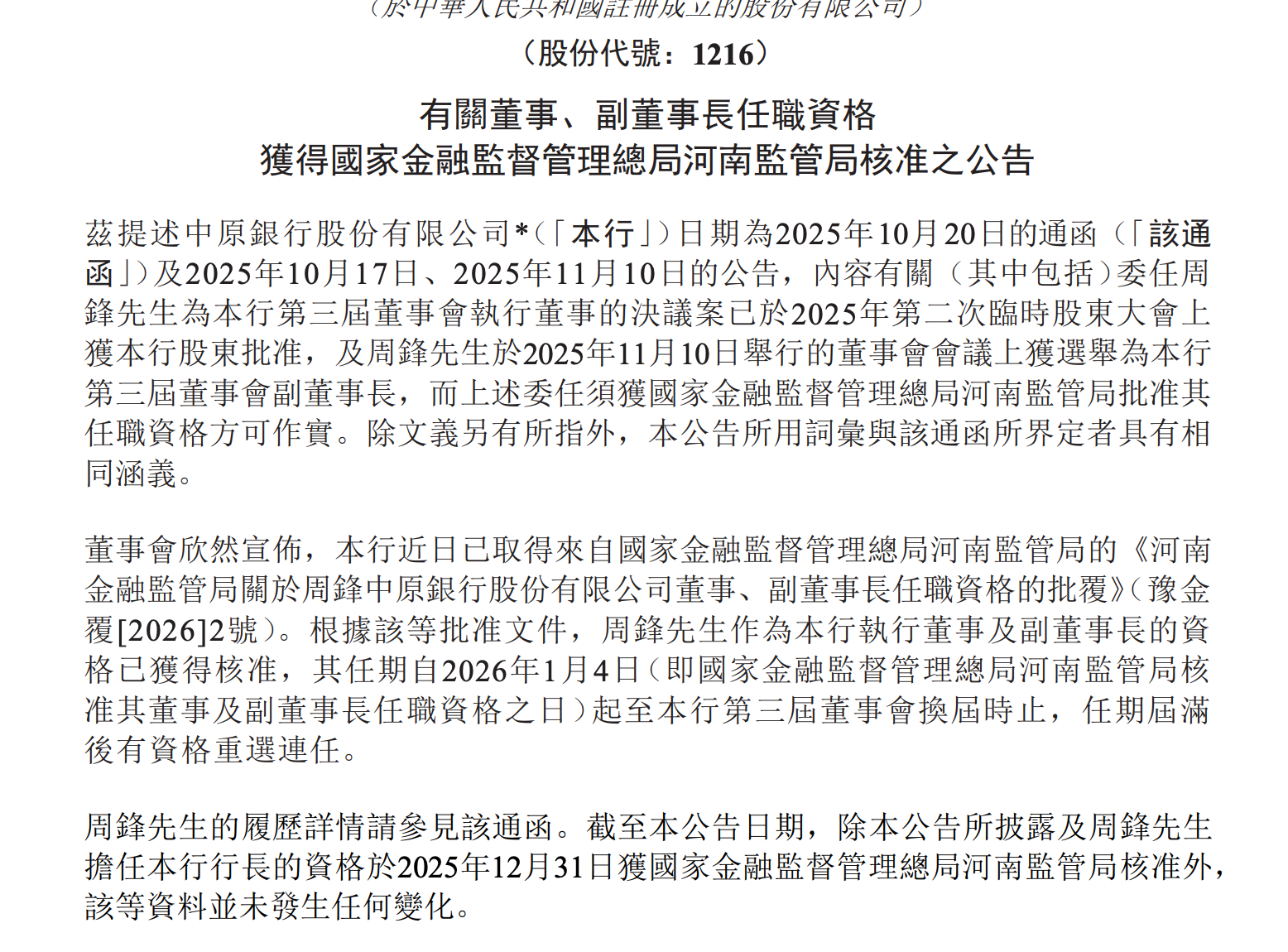 1月8日,中原银行发布公告称,其已取得《河南金融监管局关于周锋中原银行股份有限公司董事、副董事长任职资格的批复》。根据该等批准文件,周锋先生作为本行执行董事及副董事长的资 格已获核准,其任期自2026年1月4日(即国家金融监督管理总局河南监管局核准其董事及副董事长任职资格之日)起,至本行第三届董事会换届时止,任期届满后有资格重选连任。