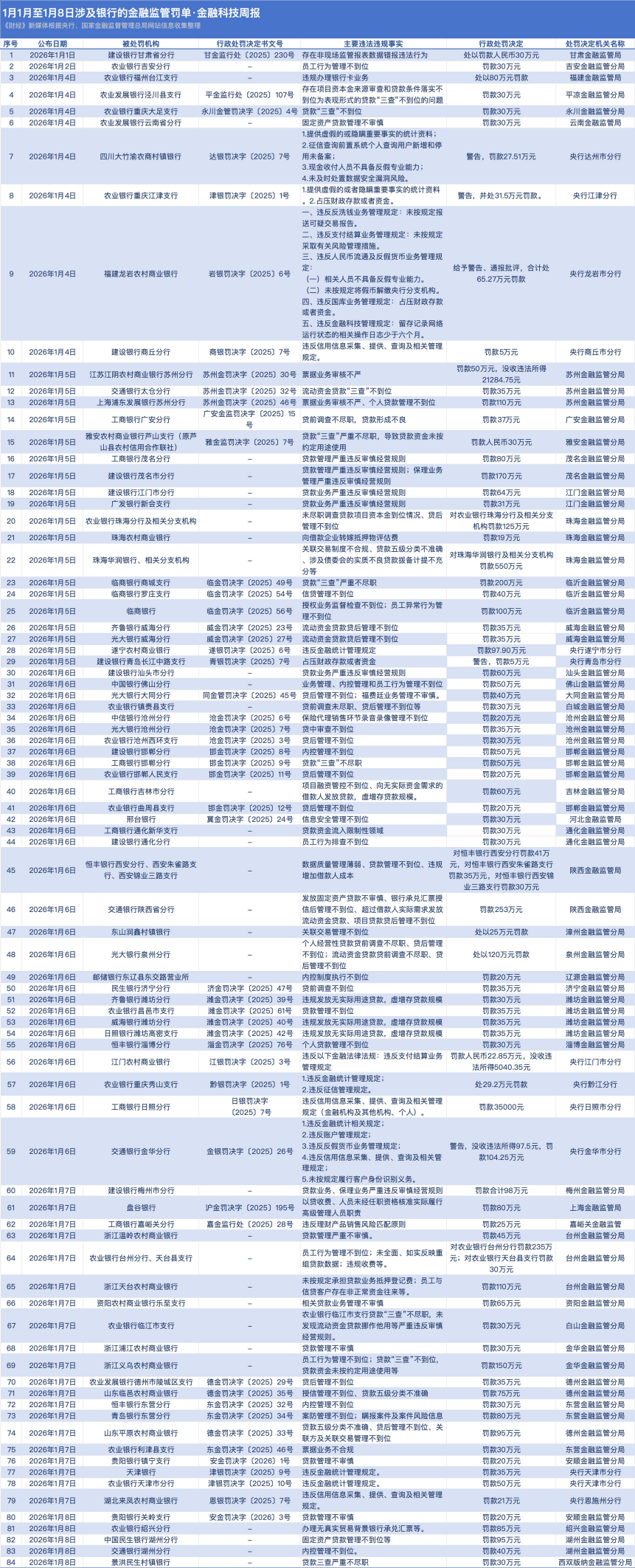 1月1日至1月8日,央行、国家金融监督管理总局官网共披露84张涉及银行的罚单。其中处罚金额最高的是,珠海华润银行及相关分支机构因“关联交易制度不合规、贷款五级分类不准确、涉及债委会的实质不良贷款拨备计提不充分等”被珠海金融监管分局罚款550万元。