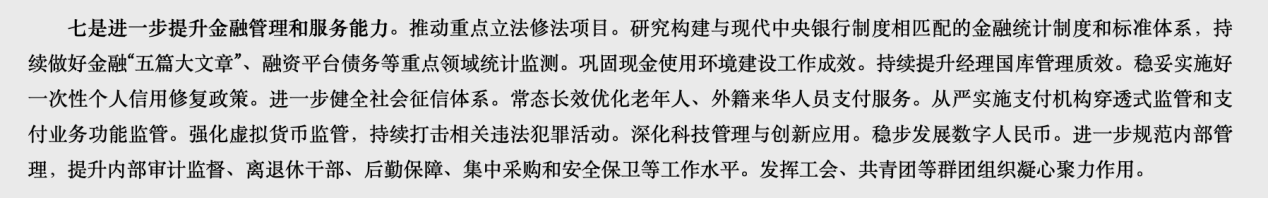 2026年1月5日至6日召开的中国人民银行工作会议提及,推动明示个人贷款综合融资成本;用好服务消费与养老再贷款,推动加大服务消费领域信贷投放;稳妥实施好一次性个人信用修复政策;从严实施支付机构穿透式监管和支付业务功能监管等内容。