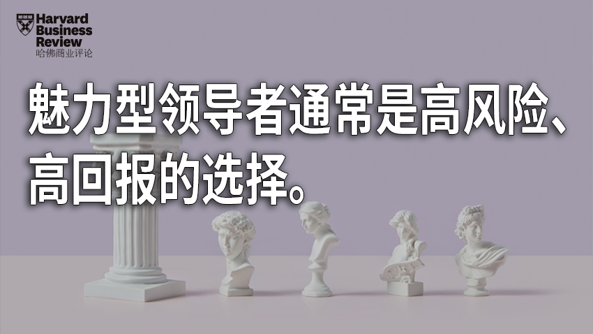 说到底,魅力型领导者通常是高风险、高回报的选择。这个类型的领导者在任何情况下都可能造成危害(由于渎职、行为不当或太过傲慢),公司必须认识到这种真实的风险。与此同时,在位企业扭转局势或初创公司成为行业标志性企业的可能性非常低——若能成功,就能获得巨大的收益。