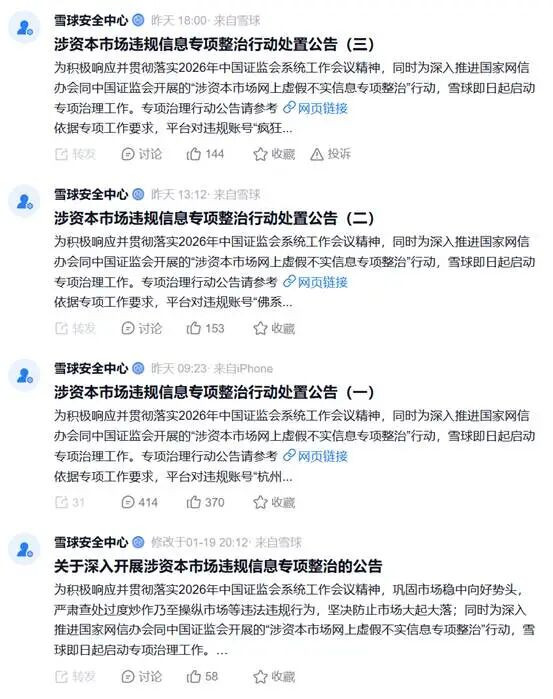 处罚发布当天,雪球安全中心公告表示,为积极响应并贯彻落实2026年中国证监会系统工作会议精神,同时为深入推进国家网信办会同中国证监会开展的“涉资本市场网上虚假不实信息专项整治”行动,雪球即日起启动专项治理工作。