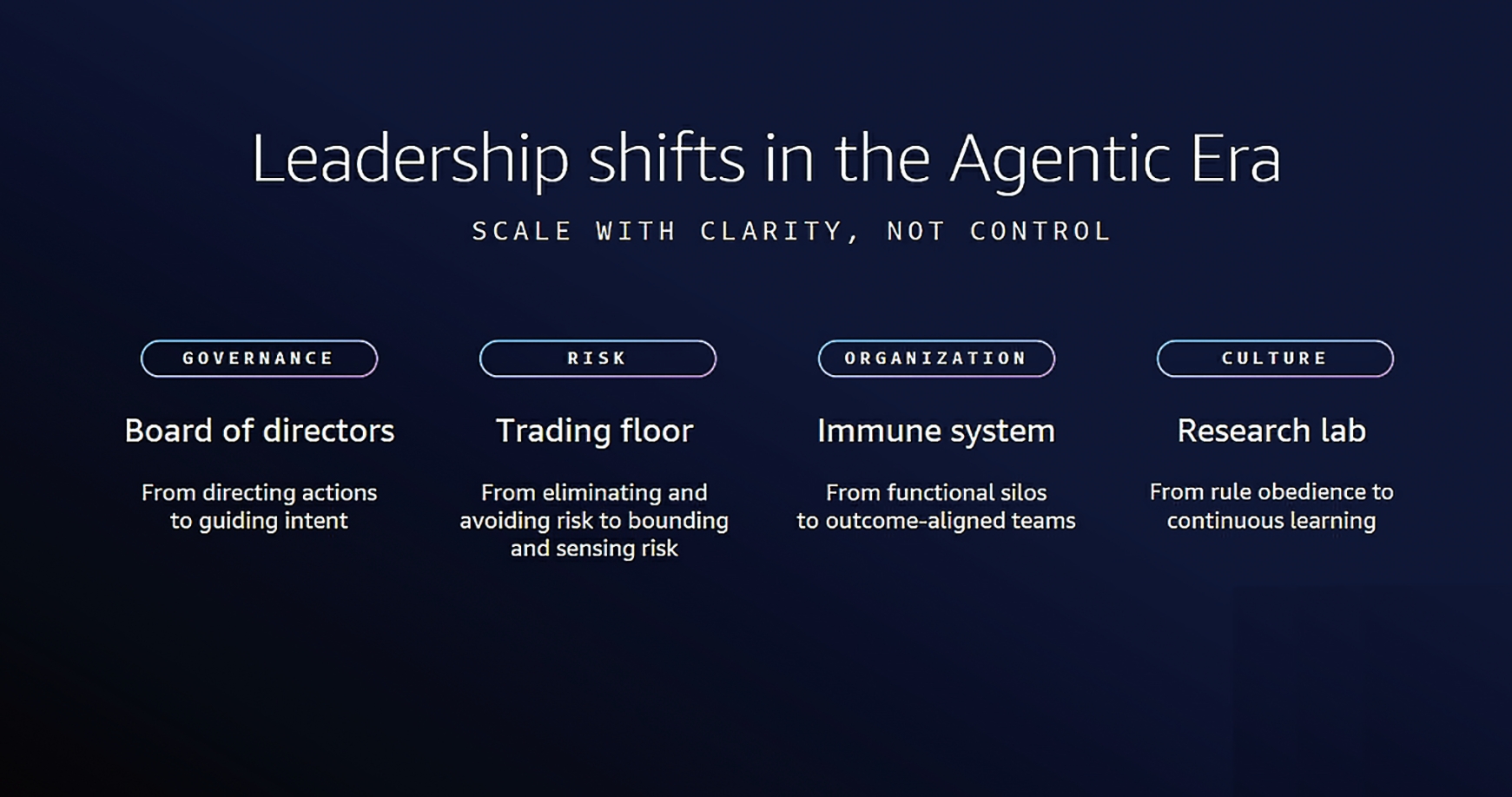 传统的治理如同收费站(Toll Gates),通过定义流程、控制每一步、清单验证实现合规。但当面对数千个高频互动的Agents时,这种模式会彻底崩塌。取代它的,是像董事会管理CEO一样管理Agent。