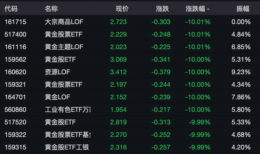 黄金价格的跳水带动了黄金股的剧烈震荡。1月30日,贵金属板块整体跌幅超8%,四川黄金、山东黄金、赤峰黄金、中金黄金等多只个股跌停,黄金股ETF、黄金主题QDII-LOF、有色ETF等基金大面积跌停。