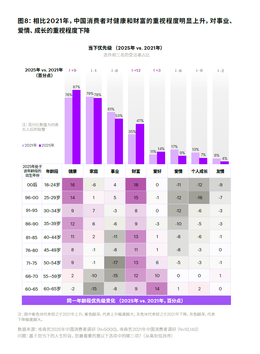 埃森哲报告印证了这一趋势,2025年,将健康视为优先事项的消费者占比87%,重视财富的占比47%,两者较2021年提升9%、12%。在韩歆毅看来,社会发展使人们更加关注两件事:财富(wealth)与健康(health),即“有钱花”和“有命花”。蚂蚁的愿景是,通过支付与金融服务让用户“口袋里多挣钱”;借“阿福”让人们“寿命更长,生活质量更高”。
