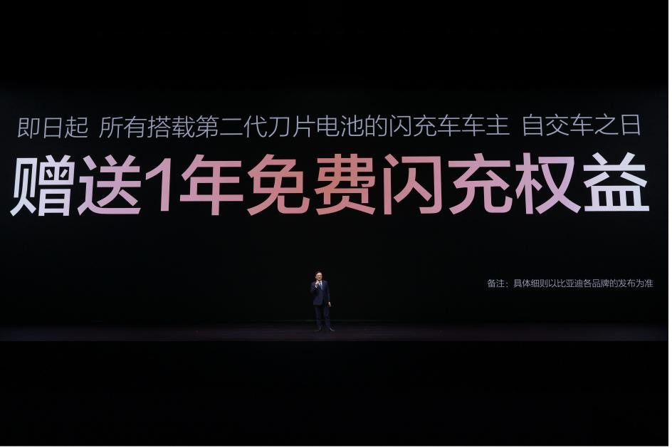 发布会现场,王传福还宣布:所有搭载第二代刀片电池的闪充车车主,均享有重磅“闪充权益”,自交车之日起,在全国闪充站可享受1年的免费闪充权益,让闪充体验更畅快。并且,在闪充免费期结束后,也会同行业保持一致,不会额外收费。