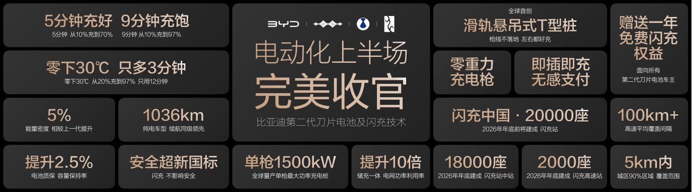 第二代刀片电池及闪充技术的发布,与“闪充中国”战略的落地,标志着 “充电慢”、“低温充电难”这两大世界性难题已被攻克,新能源汽车电动化的“上半场”至此完美收官。