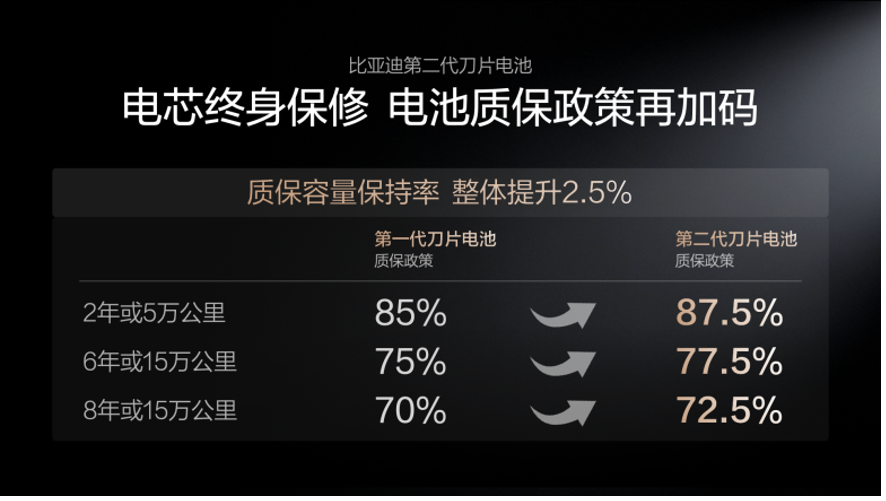 第二代刀片电池通过打造“锂离子高速通道”和“全温域智能热管理系统”,实现了更低的产热和更高效、均匀的散热,让闪充对电池寿命几乎没有影响。基于这样的底气,比亚迪还宣布电池质保政策再加码!第二代刀片电池质保的“容量保持率”整体提升2.5%,电芯依旧是“终身保修”,这就是第二代刀片电池,给所有用户的安心承诺。